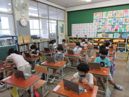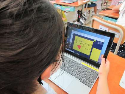 ロイロノートをつかって,すきなたべものをカードに書いています。初めは,「むずかしい」と言っていた1年生でしたが,回を重ねるごとに上手にできるようになってきました。絵もつかってあらわしています。