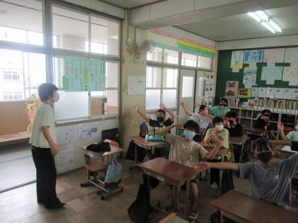 休み時間に集まっては話し合い,準備し,練習し・・・を繰り返していた本部集会委員の子どもたち。いよいよ児童朝会の日がやってきました。本部集会委員で企画した『歌詞あてクイズ』を行いました。みんなで歌って,クイズの歌詞のところはピーッとリコーダーをふきます。そして最終問題!!校長先生にお願いして,サプライズで生歌を披露していただきました。校長先生のビブラートのきいた歌声に全校児童がうっとり,そして大喜びです。さらに,校長先生の突然の教室訪問&生歌披露まで!!6−1プチコンサートは大盛り上がりです。企画や準備,進行と大忙しでしたが,子どもたちの姿は輝いていました。よくがんばりました!!