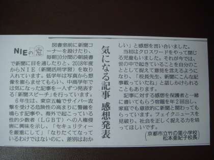 たいへんタイムリーな記事を選び,自分の考えをしっかりと話す子どもの姿に感心いたしました。また,その意見を受け,どのように感じたのか,さらに発表をしていく姿にも感心をいたしました。