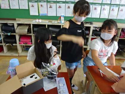 休み時間には,その作品で遊んでいる姿がありました。ゴムで動くおもちゃなどがあり,楽しんでいました。