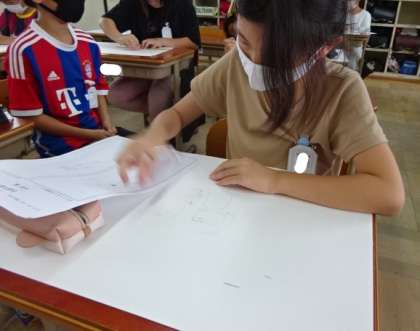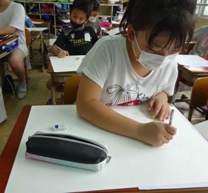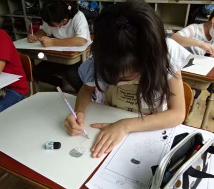 「ビリっかす」がどんな人物かをイメージしながら,下描きをしました。いろいろな「ビリっかす」が画用紙に描かれて楽しい絵になりそうです。