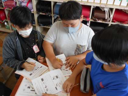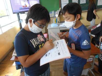 外国語の授業の様子です。何時に起きる?何時に寝る?などの聞き方や答え方を学習しました。友達の起きる時間をたずねたり,寝る時間をたずねたりしました。たくさんの友達と交流していました。