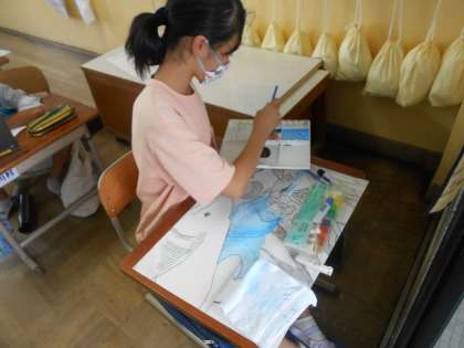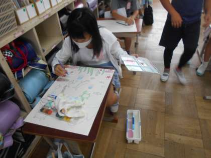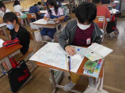 物語を読んで,そこから思い浮かべるシーンを想像しながら絵をかいています。本のタイトルは『よんひゃくまんさいのびわこさん』です。びわこは400万年前に伊賀の辺りで生まれ,火山の爆発や大陸の移動をくりかえしながら,今の場所に移ったそうです。それを絵に表現することは難しいですが,一人一人が自分の思いを頑張って表現しています。