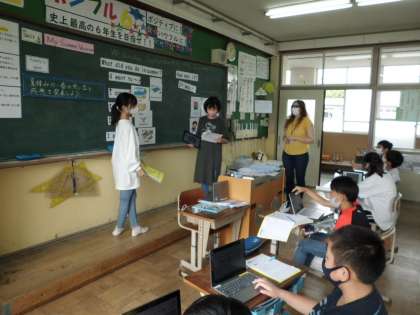 6年生の外国語の時間,自分の夏休みで一番の出来事と,その体験をどう感じたかをクラスの友達に伝え合いました。より,相手に伝わりやすくするためにGIGA端末に保存した画像も見せながらのやりとり・・・。“What's did you do in summer?” “I wet to 〜 .” “I enjoyed 〜 .”・・・初めはなかなか慣れられなかったこの表現も,もうお手の物☆友達や先生と話した分だけ確かに力になっていますよ。
