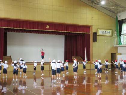 ミニスポーツ会に向かって,ダンスの練習をがんばって覚えています。かっこいいダンスの曲と,かわいいダンスの2曲を踊ります。新しい動きを教えてもらうと,大喜びでリズムにのって動いています。難しい動きがあっても,やる気満々でがんばる1年生です。