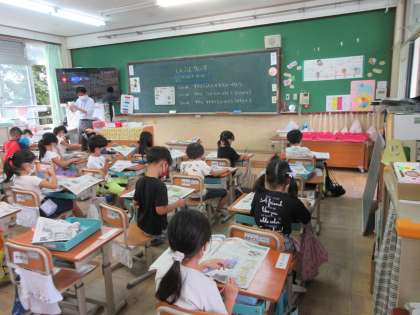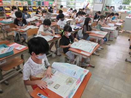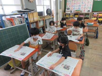 今日から3日間,朝学習の時間はジュニア新聞を読んでいます。1日目の今日は,新聞の中から絵や写真を探して,お気に入りを見つけています。きれいな星空の写真,エビのおすしの絵,りっぱなお寺の写真,長いトウガラシの写真,「あらしのよるに」の本の紹介の絵等を見つけていました。そして友だちに選んだ絵や写真と好きな理由を友達に伝えました。