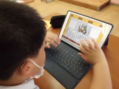 そして,今日は今まで学習してきたことのまとめとして,「お気に入りの場面を紹介する文を作ろう。」と題して学習しました。GIGA端末のアプリを使って,お気に入りの場面の挿絵を写真で撮り,音声入力などで「お気に入りの場面を紹介する文」を作ることができました。最後は,テレビ画面に映し出して,発表しました。一人一人の子どもたちの真剣な目がすばらしいです!