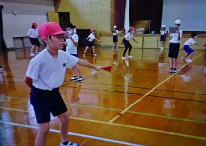 竹の里ミニスポーツ会の団体演技で踊る「よっちょれ」。踊りを覚えて鳴子を持って練習しています。