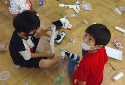 今日は,子ども達が家から持ってきた廃材を集めた「ガラクタカラバコ」の中身を一挙に公開し,何ができるか試してみました。
