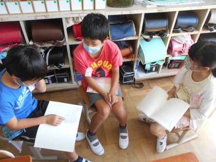 算数では分母も分子も違う分数の大きさはどうやって比べるのかを考えました。「分母が同じだったら比べられたけど」という友達のつぶやきをもとに,分母を同じ数にそろえる方法を考えました。今まで学習した公倍数の考え方をもとに,友達に教え合いました。今日の学習で,通分という新しい考え方を学びました。