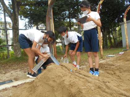 流れる水の働きの学習をしています。今日は砂場に山と川を作り実際に水を流してみました。川の曲がりの内側と外側とではどのような違いがあるのか,川の上流と下流とではどのような違いがあるのか観察しました。GIGA端末を利用して水が流れる様子を撮影しました。学習した様子を記録しておけるのでとても便利です。