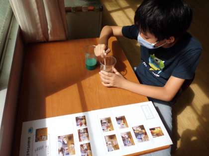 子どもたちは,工程表を見ながら,水・好きな色の絵の具・お湯・ホウ砂などの材料を計量カップなどで慎重にはかっていました。