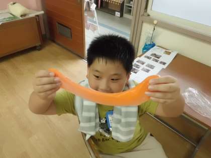 様々な材料や薬品を混ぜ合わせることで,物体が変化する不思議を実感しながら学習することができました。完成したスライムの感触を楽しみながら嬉しそうに様々な形にしていました。