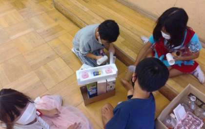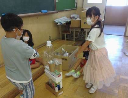 「あそんで,ためして,くふうして」の学習では引き続き,集めた廃材を使って遊びを考えています。今回は「つむ」限定で遊びました。