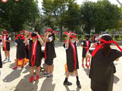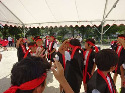 はっぴを羽織り,はちまきをつけます。友達に手伝ってもらいながら,衣装を着る子ども達。あっという間にかっこよくなりました。