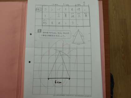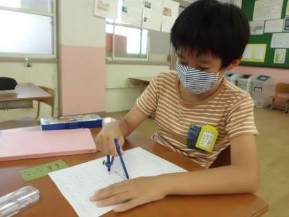 今日は,昨日学習した「二等辺三角形」「正三角形」をコンパスを使って書く学習をしました。「難しいな…」と言っている児童も一生懸命取り組むことで少しずつかけるようになってきました。