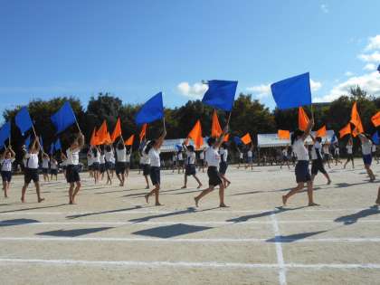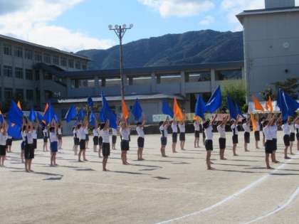団体演技ではフラッグに挑戦しました。フラッグを降ると大きな音がします。運動場に力強い音が響き渡っていました。その音からも子どもたちの気持ちがたくさん伝わってきました。