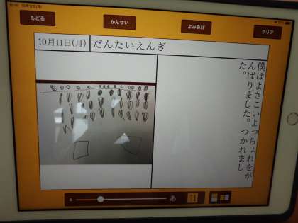 まず,がんばったことの絵を描き,その絵をカメラ機能で撮影し,「えにっき」アプリの写真の欄に張り付けます。そして,文作り!
