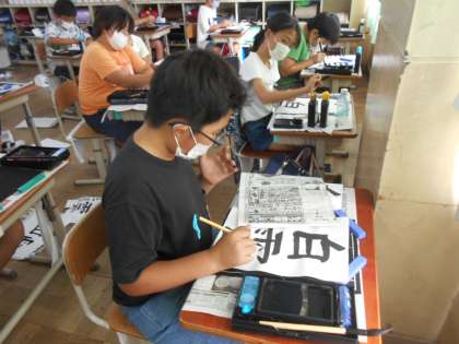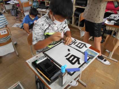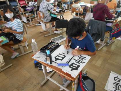 書写の時間の様子です。今日チャレンジする文字は『白雲』です。文字の大きさに気をつけて書きました。画数の少ない文字と画数の多い文字の組み合わせはとても難しかったです。画数の少ない文字は小さく,画数の大きい文字は大きく書くことに気をつけるとバランスをとりやすく,きれいに書くことができました。