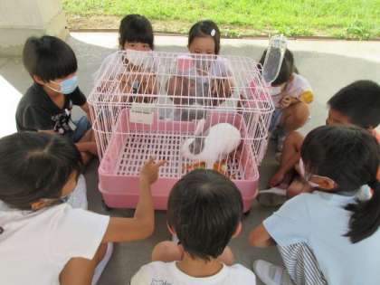 生活科で,学校のウサギとなかよくなる学習をしています。竹の里小学校には,ウサギがいます。いつも飼育委員さんがお世話をしてくれています。この日,もらっていた野菜(キャベツとニンジン)を食べている様子を観察しました。他に,どんなものを食べるのでしょう。これから,調べていきます。