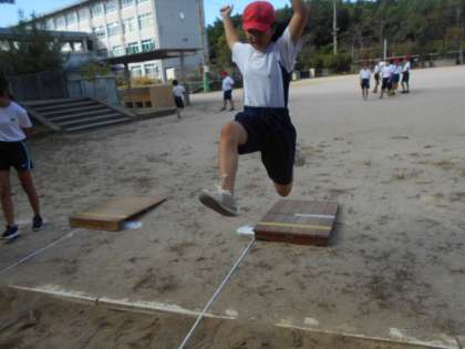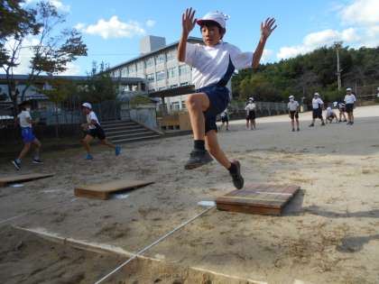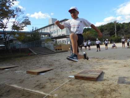 走り幅跳びの学習が始まりました。力強い踏み切りや空中姿勢,両足着地を意識しながら学習を進めています。自分の目安の記録に到達できるように頑張っていきます。より遠くに跳ぶために大切なことを話し合ったり,跳び方を工夫したりしながら学習を進めていきたいです。