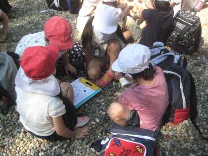 大原野神社に着いた後,福西小学校のお友達とグループで自己紹介をしました。そして,おちたおちたゲームや しりとり,あっちむいてホイをして遊びました。