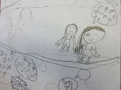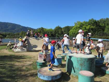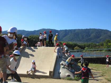 お弁当の後は,大蛇が池公園まで歩きました。昼間は暑くて,歩く歩調もゆっくりになりましたが,公園に着くとみんな元気復活です。福西小学校のお友だちと一緒に,公園で思いっきり遊びました。帰った後は,見つけたカードをかきました。帰り道に,福西小学校に帰っていくお友だちの姿を遠くに見つけると,別れを惜しむように声をかけていた竹の里の子どもたちの姿が印象的でした。また,秋の「わくわくさんぽ」で会いましょうね。
