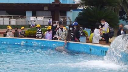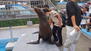 アシカ・イルカ・アザラシとのふれあいです。そっと触っています。