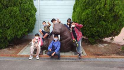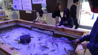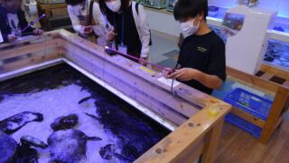 館内をグループで散策しています。魚釣りのようなエサやりもしてます。