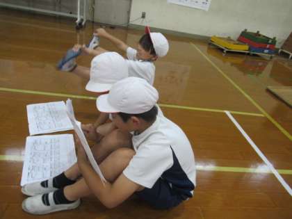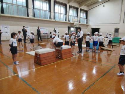 ねらい2では,少し頑張ればできそうな技に挑戦しました。自分の気を付けるポイントを友達に伝え,できているがどうかを見てもらいます。その後,「両手を同じようについたほうがいいよ。」「あと少し足をひきつければ跳べると思うよ。」などのアドバイスを伝えます。振り返りでは,「友達のアドバイスを聞いてやってみたら,できるようになったよ。」や「アドバイスしてもらったことを意識してやればもう少しでできそう。」など学びを振り返っていました。