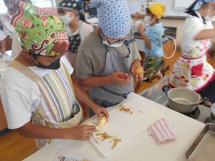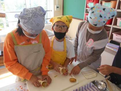 今日は初めての調理実習を行いました。じゃがいもの皮をむき,ゆでました。また,青菜もゆでました。食材の種類によってゆで方に違いがあることに気づくことができました。初めての調理実習で,準備から後片付けまで時間はかかりましたが,これからも実習を積み重ねて,手際よくできるようになってほしいと思います。