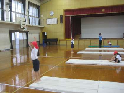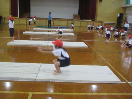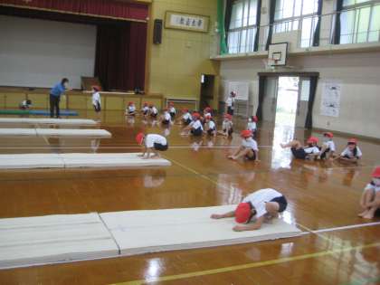「マットあそび」の学習をしています。いろいろな前回りに挑戦しています。いい出来栄えになるように,友だちのよいところを見つけています。きれいな姿勢で回れるようにがんばっています。