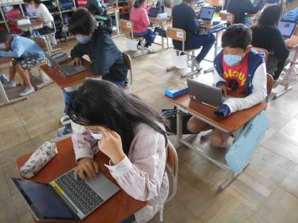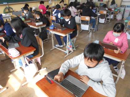 ジュニア京都検定に向けて自主学習ノートを使ったり,GIGA端末を用いたりして学習してきました。テキストを読んだり,過去の問題を解いたりする過程を通して自分たちの住む京都について新しいことを知ることができました。「ここ行ったことある。」「これ知ってる。」などと言いながら大変意欲的に学習できていました。今日は学習したことを発揮する日です。みんなが集中して問題に取り組んでいました。