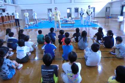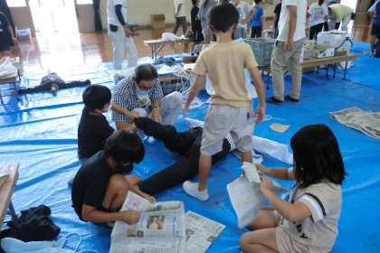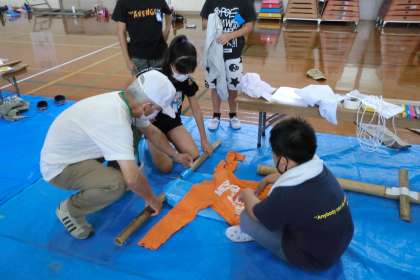 グループごとにまずはどんなかかしにしようかコーディネートから考えます。服が決まったら大きな竹に服を着せて,中に新聞などをつめていきます。少しずつ体がしっかりして人らしくなってきました。