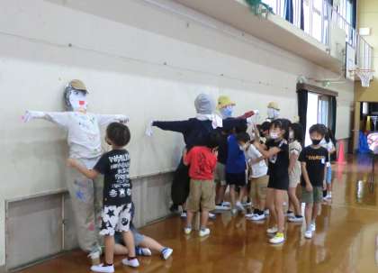 優しい表情,きりっとした強そうな表情,畑にいたずらするからすたちをびっくりさせよう!と中にはカラフルでインパクト大な顔のかかしも完成しました!子どもたちは,できあがったかかしたちに名前をつけて手をつないだりハグをしたりと愛着がわいてきたようです。