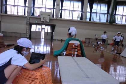 タブレットで模範演技を見たり,自分の様子を撮影して技の上達に役立てることもできるようになってきました。