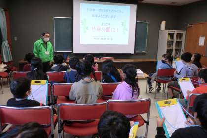 竹林公園では竹の先生に竹についてたくさんのお話を聞きました。総合「竹はかせになろう」で竹について調べてきていたのですが,初めて聞く内容もたくさんありました。聞いたことはしっかりメモをとって今後の学習に役立てていきます。
