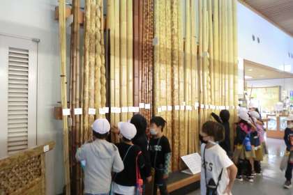 竹資料館では竹で作られた製品や身近なもの,またさまざまな種類の竹の展示を見ました。エジソンが発明した電球のフィラメントに竹が使われていること,割りばしや竹刀,茶せんなども竹が使われていることが分かり驚きの声があがりました。