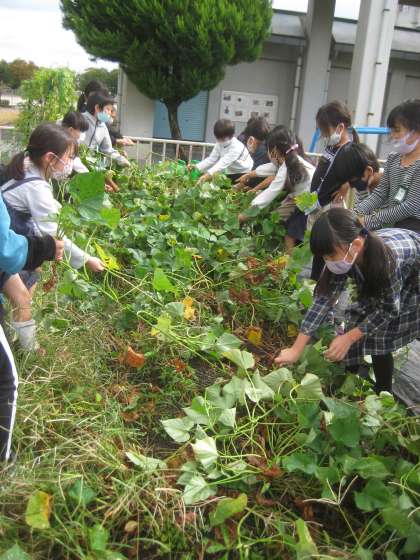 サツマイモの収穫をしました。サツマイモのつるを引っ張ると,大きなサツマイモが顔を出して,喜びの大歓声が起こりました。みんな夢中になって宝を探すように,畑の土を掘りました。子ども達の顔くらいもあるような大きなサツマイモも収穫できて,嬉しさいっぱいの生活科の時間でした。