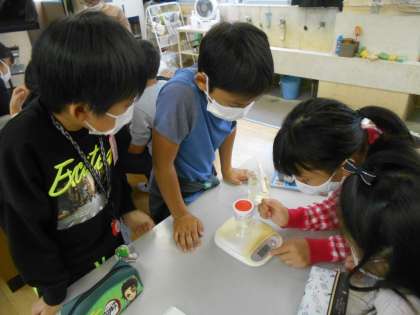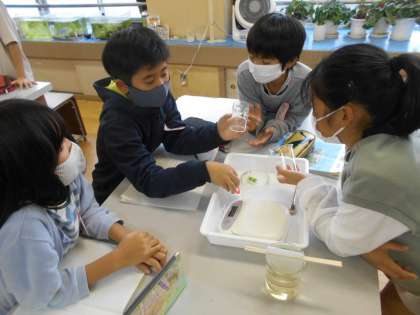 理科,ものの溶け方の学習の様子です。ものが溶ける前と溶けた後で重さに違いがあるのかどうかについて調べる方法を話し合いました。限られた実験器具を使って調べる方法をグループで出し合っていました。
