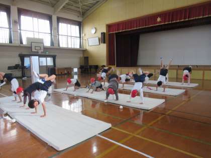 体育科「マット運動」では,準備・体慣らし・活動・後片付けの順で活動しています。体慣らしでは,体を後ろまで倒して起き上がる「ゆりかご」,腰の位置を高く上げて蹴る「ロバキック」,腰の位置を高く上げて両足の裏を打つ「カエルの足打ち」,前転,後転をしています。これらの運動が準備運動となります。