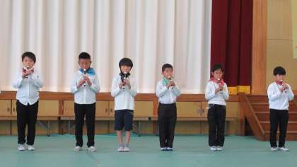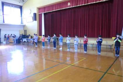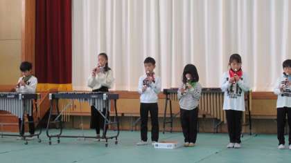 合奏「パフ」のグループはリコーダー,鉄琴,カスタネット,タンバリン,バスオルガン,ピアノでの合奏を行いました。1回目は全員でリコーダー演奏,2回目はそれぞれの楽器とリコーダー二重奏です。3年生になって始めたリコーダーで一つ一つの音を丁寧に,そしてそれぞれの楽器の音を聴き合いながら一つの音楽になるよう練習してきました。練習を重ねるごとにそれぞれの音色が次第にまとまっていき,一つの音楽になったことに喜びを感じられたようです。 (一部は練習時の写真です)