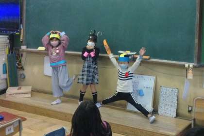 図工の「わっかでへんしん」で作った作品を身につけて,ファッションショーを行いました。体育参観で踊った「Butter」の曲に合わせて教室の後ろから前まで歩き,最後にポーズをとりました。