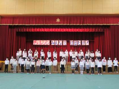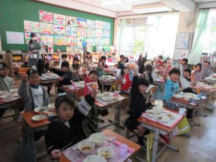 初めての学習発表会です。たくさんのお家の方に来ていただいて,やりがいがありました。みんなの気持ちが一つになって,がんばる姿がすてきでした。そして,今日が一番いい出来栄えでした。これからも夢に向かって,「チャレンジ みんなで はばたけ!」です。給食の時間に,牛乳がなかったので,デザートの柿で「がんばったね!」の乾杯をしました。大きな行事が終わった後の給食は,最高においしかったです。お家の方々,衣装のご協力ありがとうございました。