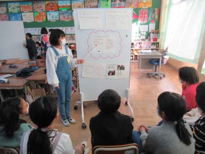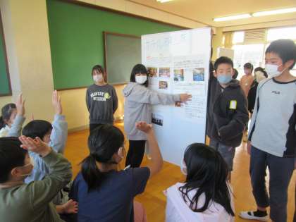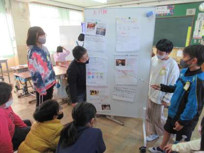 修学旅行で体験したことや学んだことについて,5年生にポスターセッションで伝えました。5年生が来年,楽しむことができるように,いろいろなコーナーに分かれてそれぞれ大切なポイントを,クイズや動画,劇など様々な工夫をしながら伝えることができました。学習が終わったあと,5年生からは「早く修学旅行に行きたくなってきた!教えてもらったことを私たちもやってみたい!」や「自分たちが6年生になった時に,こういう風に次の5年生に伝えたいな・・・」などのつぶやきが聞こえてきました。昨年,6年生にやってもらったことを今度は自分たちが5年生にし,5年生がきっと来年,また次の5年生に伝え・・・6年の姿からあこがれをもち,学びがつながっていく素敵な時間となりました。