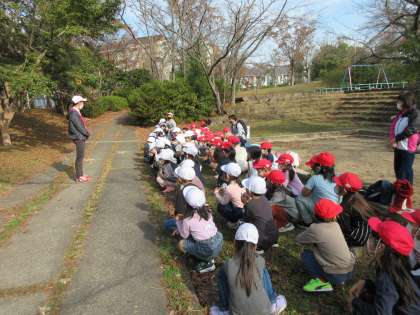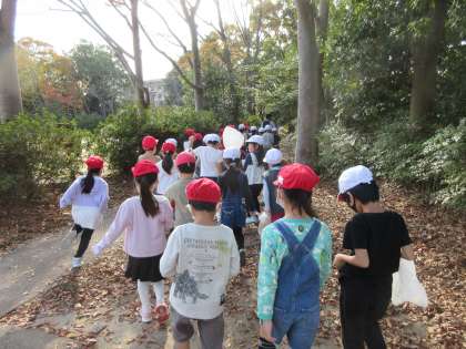 生活科の学習で,久しぶりの「わくわくさんぽ」に行きました。福西公園へ,福西小学校の1年生と一緒に行きました。秋の遠足で,一緒になったグループで,活動をしました。公園の中の大きなドングリの実はあるところを,福西小学校の友だちが教えてくれました。