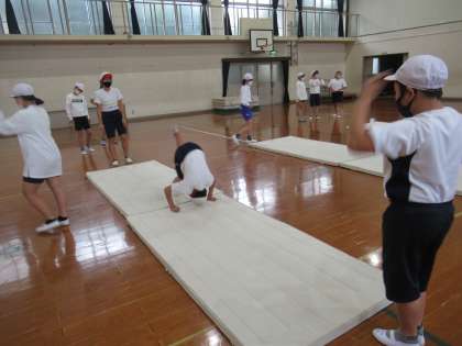 体育の学習でマット運動をしています。まずは,今できる技で連続技や組み合わせ技に挑戦しました。久しぶりのマット運動で,最初は苦戦している子どももいましたが,ポイントを確認しながらやっていくうちに,感覚を取り戻していました。次に,少しがんばれば出来そうな技に挑戦しました。「もっと,手でマットを強くおしてさ・・・」など,アドバイスをし合いながら頑張っていました。