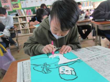 図工の学習で版画をしています。今回のテーマは「12歳のわたしたち」です。版に描かれた自分を,彫刻刀で丁寧に彫っています。どんな自分になるでしょうか。完成が楽しみです。