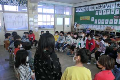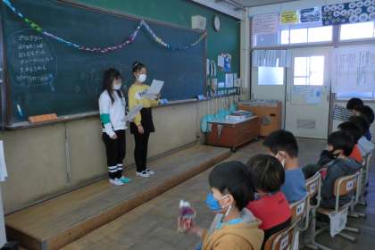 学級会で決まった内容で行ったなかよしになろう会,当日は司会やゲームの進行などすべて自分たちで言葉も考えて進めました。