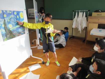 『「鳥獣戯画」を読む』の筆者の表現の工夫を学び,その表現を生かして自分が選んだ絵について解説しました。実況の技や体言止めの技,呼びかけの技など,筆者から学んださまざまな表現の工夫を使って,聞き手をひきつける解説をしていました。発表を聞いた後は絵を見ながら「私だったらここが・・・に感じるな」や「さっき同じ絵での○○さんの解説を聞いたけど,全くちがうとらえ方をしているから・・・」など,それぞれのとらえ方のちがいを楽しむ交流をしていました。